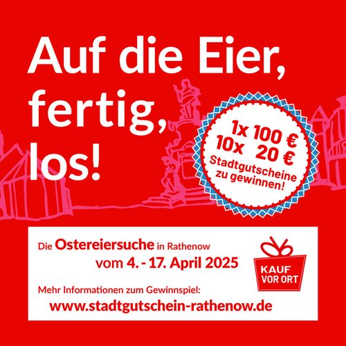 Die Kooperationspartner, die Stadt Rathenow, der Verein „Unternehmer für Rathenow“ und die Rathenower Wärmeversorgung GmbH, laden herzlich dazu ein, an der Osteraktion im Rahmen des Stadtgutscheins für Rathenow teilzunehmen.