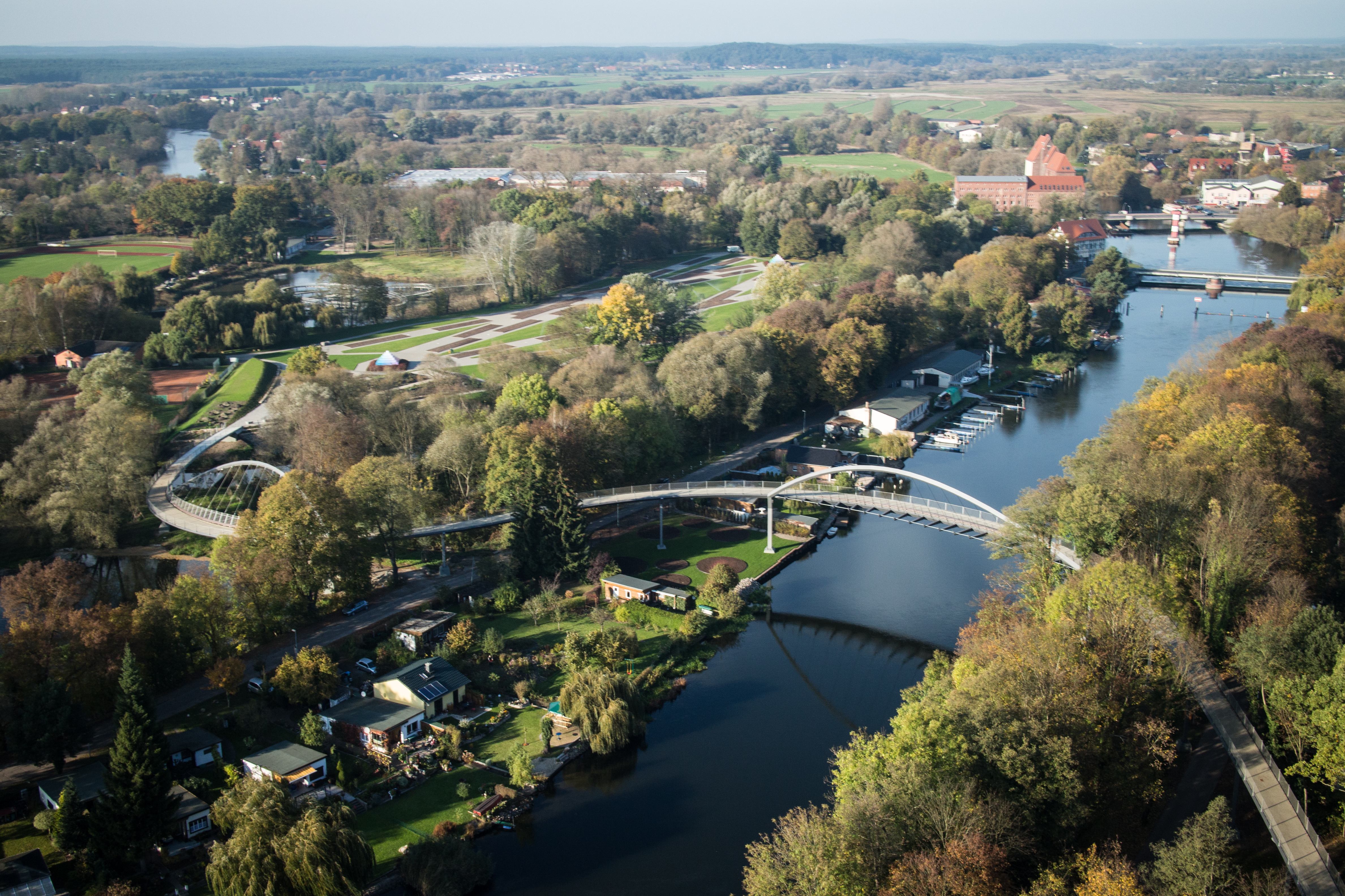 Der erste Spatenstich erfolgte bereits am 17. Dezember 2012 und in nur 22 Monaten wurde die imposante Stahlkonstruktion errichtet. Mit einer Länge von 348 Metern und einer S-förmigen Kurve überspannt die Brücke die Havel und das Hellers Loch. Die Brücke wurde mit zwei Bogenbrücken und Rampenbrücken ausgestattet, wobei der einseitige Seilaufbau den Blick auf die Baumkronen freigibt und den Besuchern einen weiten Blick in die Havellandschaft ermöglicht.