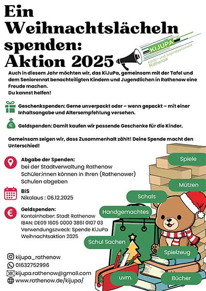 Das Kinder- und Jugendparlament Rathenow lädt herzlich dazu ein, in diesem Jahr Weihnachten für bedürftige Kinder in unserer Stadt erneut unvergesslich zu machen.