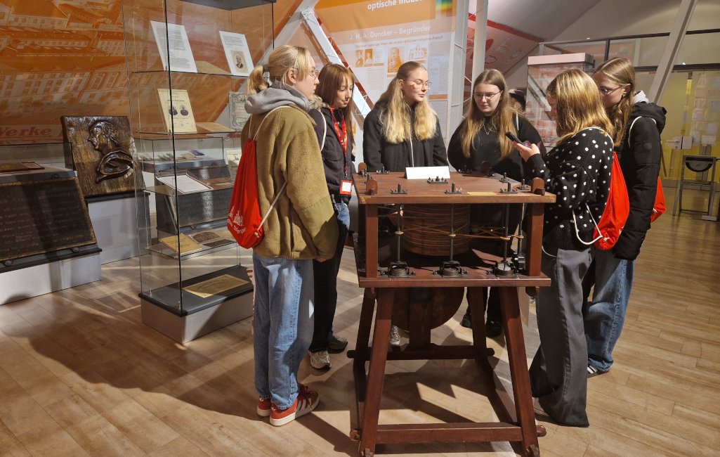 Parallel besuchten andere Teams den Duncker Gewerbepark und trafen dort auf Tradition neben Moderne: Während sie in der Firma Duncker Geräteservice die anspruchsvolle manuelle Wartung und Reparatur historischer und neuer Ferngläser gezeigt bekamen, lernten sie bei der MOM by Fabema GmbH eine innovative digitale Gesichtserkennungs-App für Brillenträger „Made in Rathenow“ kennen.