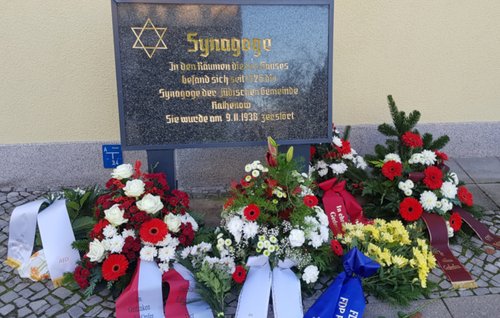 Am 9. November 2021 legten der stellvertretende Bürgermeister Jörg Zietemann, Mitglieder der Stadtverordnetenversammlung sowie Bürgerinnen und Bürger vor der ehemaligen Synagoge in der Wilhelm-Külz-Straße in Rathenow Blumengebinde zum Gedenken an die Opfer der Novemberpogrome nieder.