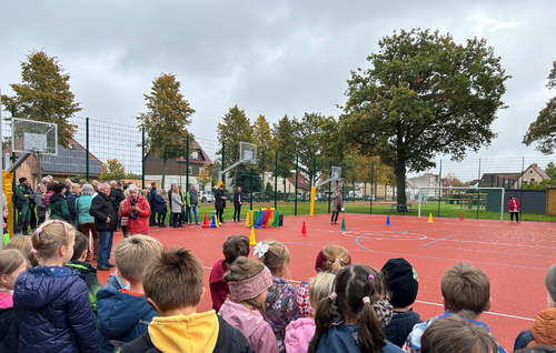 Zur feierlichen Übergabe überreichte der Bürgermeister der Schule mehrere Bälle als Einweihungsgeschenk, während Bäckermeister Möhring traditionell Brot und Salz überbrachte. Die Schülerinnen und Schüler bedankten sich mit einer kleinen Aufführung, bevor sie im Anschluss alle neuen Sportstationen ausgiebig testeten.