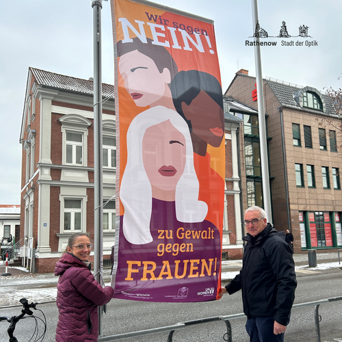 Jana Reinhardt vom Beratungs- und Krisenzentrum für Frauen und Matthias Remus, der Erste Beigeordnete der Stadt Rathenow, hissten gestern die Flagge zum heutigen Internationalen Tag zur Beseitigung von Gewalt gegen Frauen vor dem Rathaus.