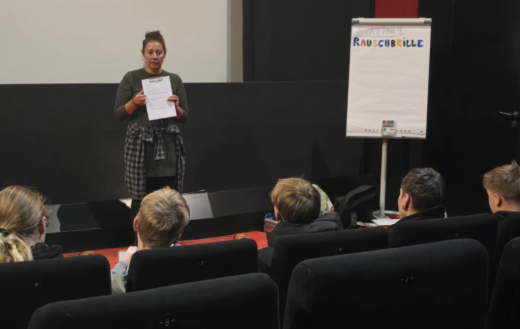 Im Zentrum des Projekts stand das Thema „Risiko Alkohol – Jugendliche stärken“, das Jugendlichen auf altersgerechte und lebensnahe Weise vermittelt wurde. Die Schülerinnen und Schüler durchliefen in Kleingruppen sechs interaktive Stationen. Fachkräfte begleiteten sie durch Themen wie Suchtverläufe, Erkennen eigener Ressourcen sowie Stationen zum Ausprobieren wie die Suchttreppe, Skalierungsübungen, ein Präventionsquiz und einen Rauschbrillen-Parcours. Anschließend wurde ein altersgerechter Film zum Thema Alkohol- und Mischkonsum als Impuls für Gespräche über eigene Erfahrungen und Werte gezeigt.