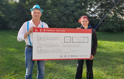 Am Montag, dem 26. September 2022, überreichte die Stadtverordnete und Vorsitzende des Ausschusses für Bildung, Kultur, Jugend, Sport und Soziales Diana Golze vor dem Rathenower Rathaus den Scheck an den „Dorfspatzen“ Andreas Kubale. Das Geld wird für eine Musikanlage und Mikrofone verwendet, die die Gruppe zukünftig bei ihren Auftritten begleiten werden.