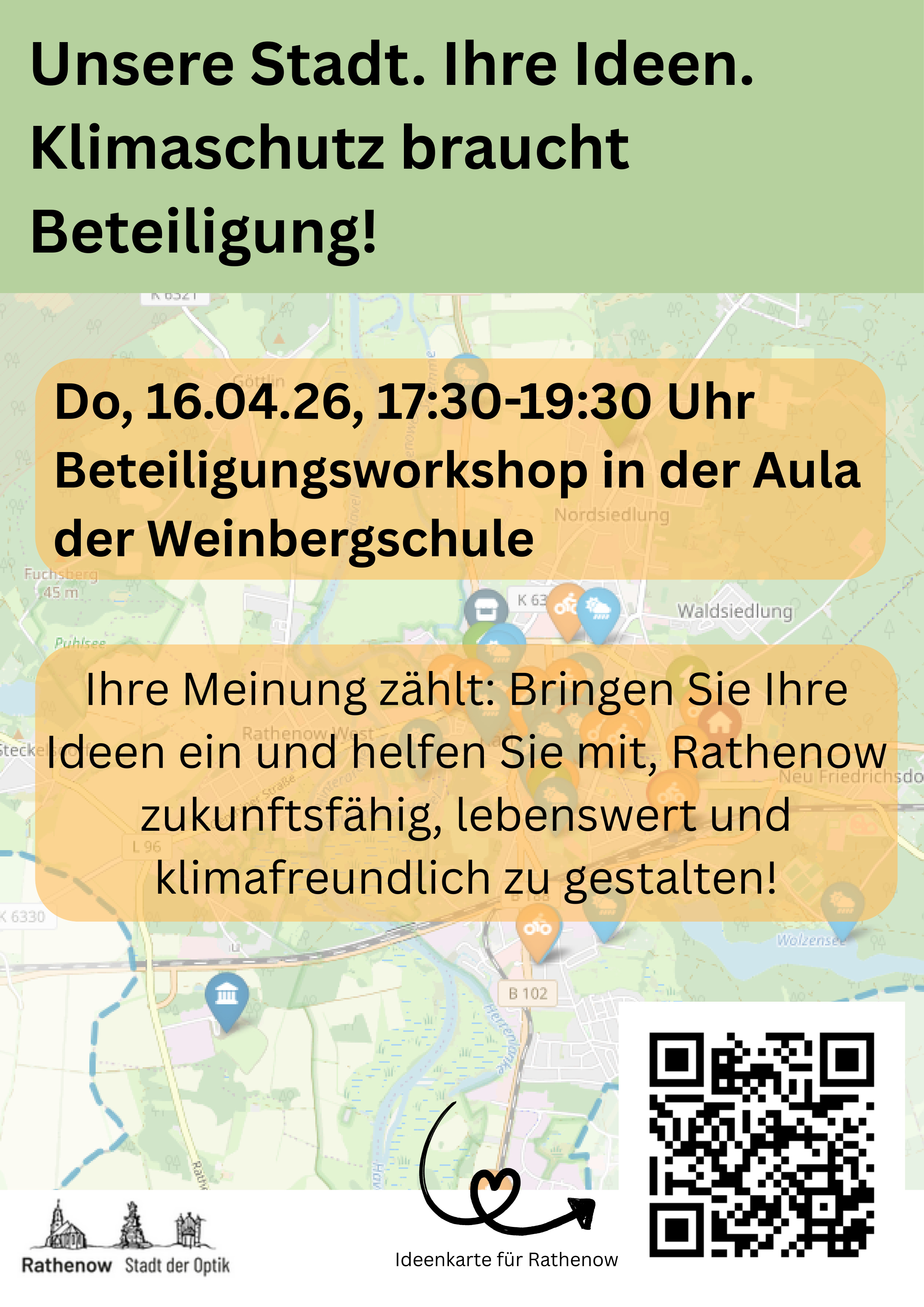 Die Stadt Rathenow lädt zu zwei Beteiligungsveranstaltungen im Rahmen der Erarbeitung des neuen Klimaschutzkonzeptes ein. Am 15. April 2026 sind insbesondere Jugendliche eingeladen, ihre Perspektiven und Zukunftsideen einzubringen. Die Veranstaltung beginnt um 15:30 Uhr in der Aula der Weinbergschule, Schulplatz 3 in Rathenow. Eine Anmeldung ist nicht erforderlich. Am 16. April 2026 folgt um 17:30 Uhr eine weitere Veranstaltung für alle Bürgerinnen und Bürger, ebenfalls in der Aula am Weinberg. Dort werden Ideen zu verschiedenen Handlungsfeldern gemeinsam diskutiert und weiterentwickelt. Grundlage bilden unter anderem bereits vorliegende Ergebnisse aus Analysen, Befragungen sowie die Beiträge der Jugendlichen.